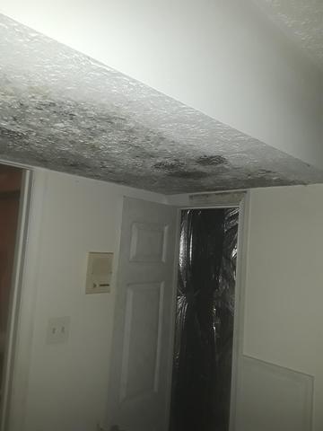 This is an example of why it's so important to properly address a damp crawl space. The entrance to the crawl space is located in this room. The moisture from the crawl space has escaped from the crawl space into the living space of the home. The drywall ceiling has become saturated and is now a perfect environment for the mold to flourish. Until the crawl space is properly addressed this problem will continue.
