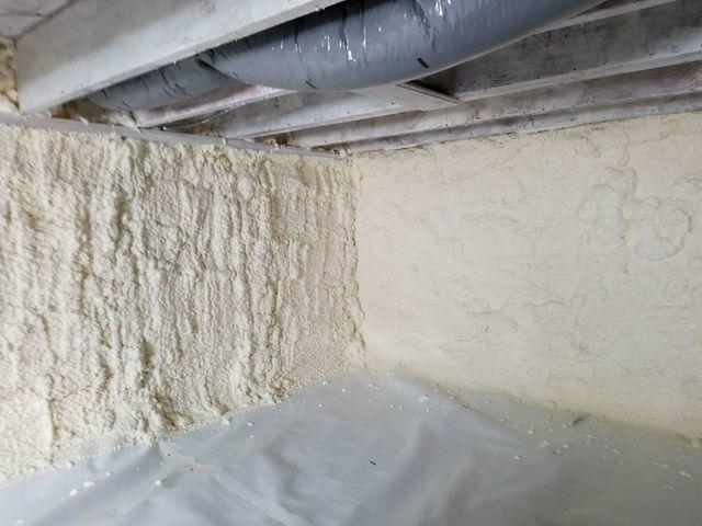 Closed cell spray foam is being used in this picture to air seal and provide a thermal barrier for this newly encapsulated crawl space. Closed cell spray foam provides an instant air barrier which keep cold air out of the crawl in the winter, and hot/humid air out of the crawl in the summer. Closed cell is also used below grade like this because it will not allow humidity or vapor to travel through it.